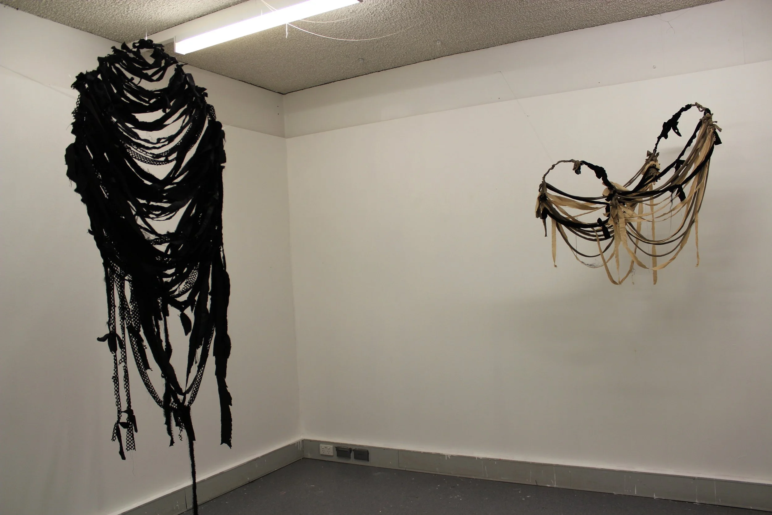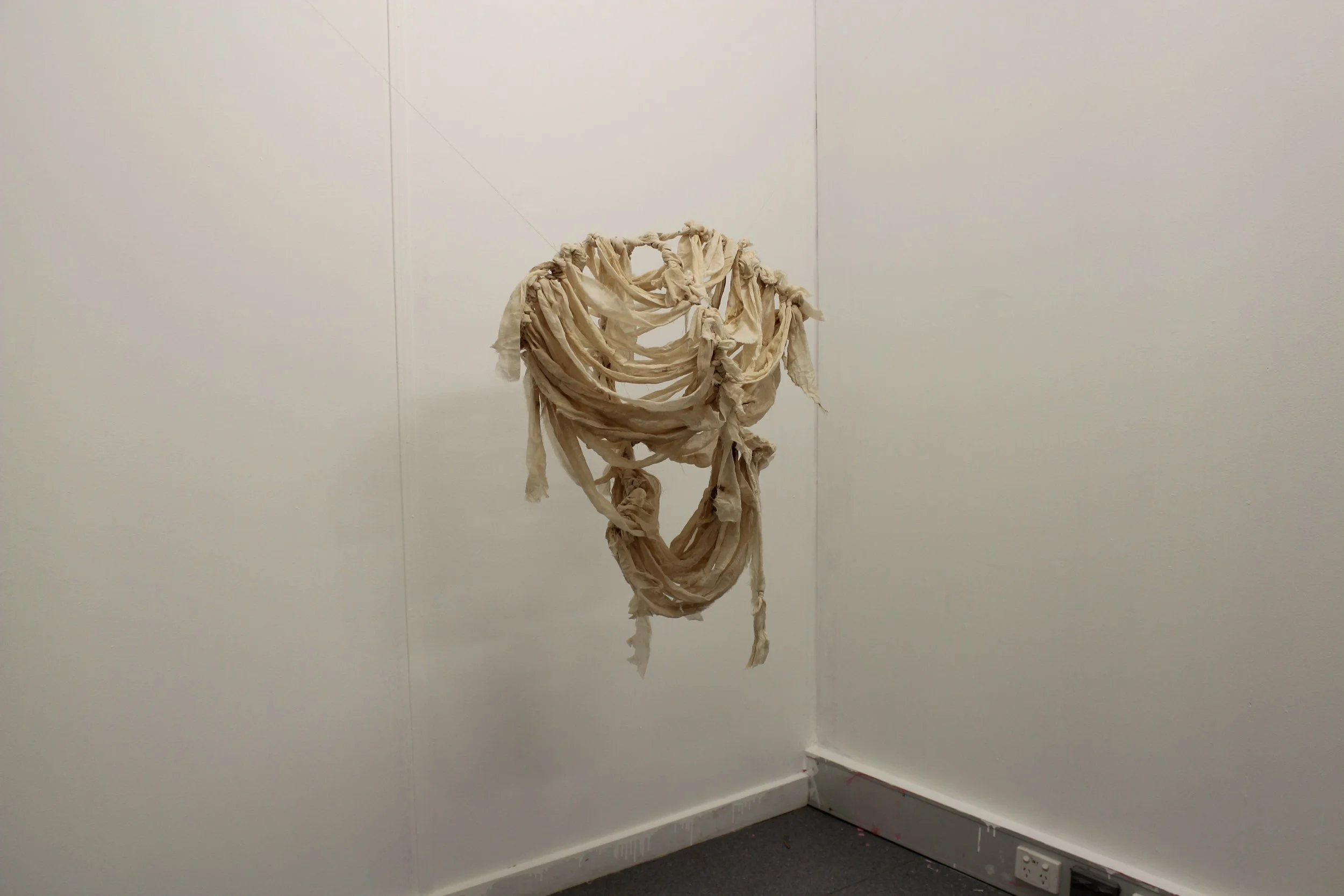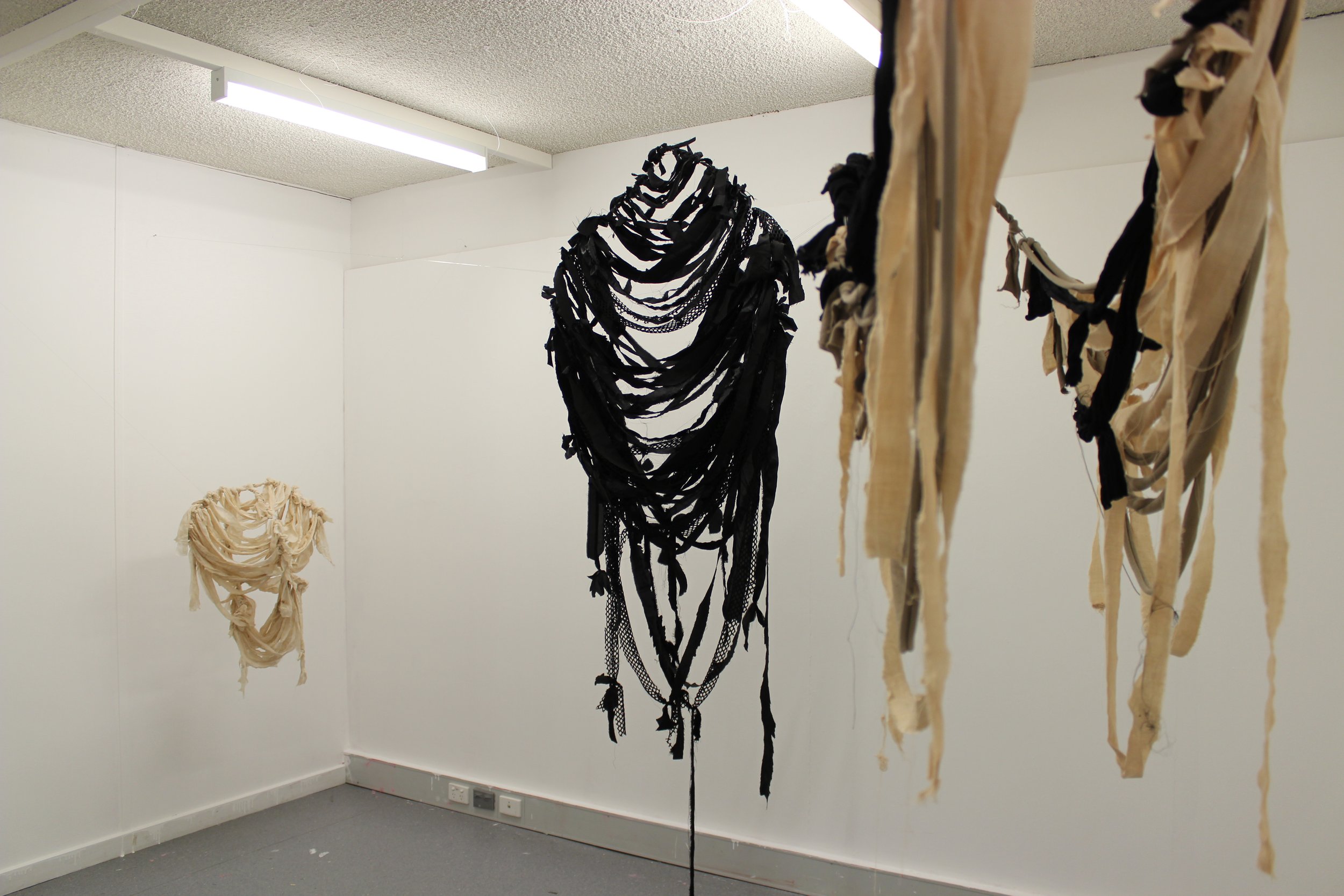 ‘I donno, it’s not so much an emotion but more of an urgency’ 2022, installation view, hand-dyed and recycled fabric, metal